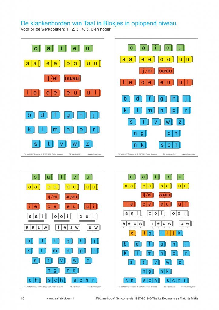 De basiswerkvormen –coderen en woorden bouwen met de klankblokken– komen aan bod bij de diverse werkvormen in de werkboeken en handleidingen van Taal in Blokjes. De werkboeken zijn voor zelfstandig gebruik in een groepje of in de klas. Elke bladzijde bevat een voorbeeld waardoor de leerling snel ziet wat de bedoeling is en zelfstandig kan werken.